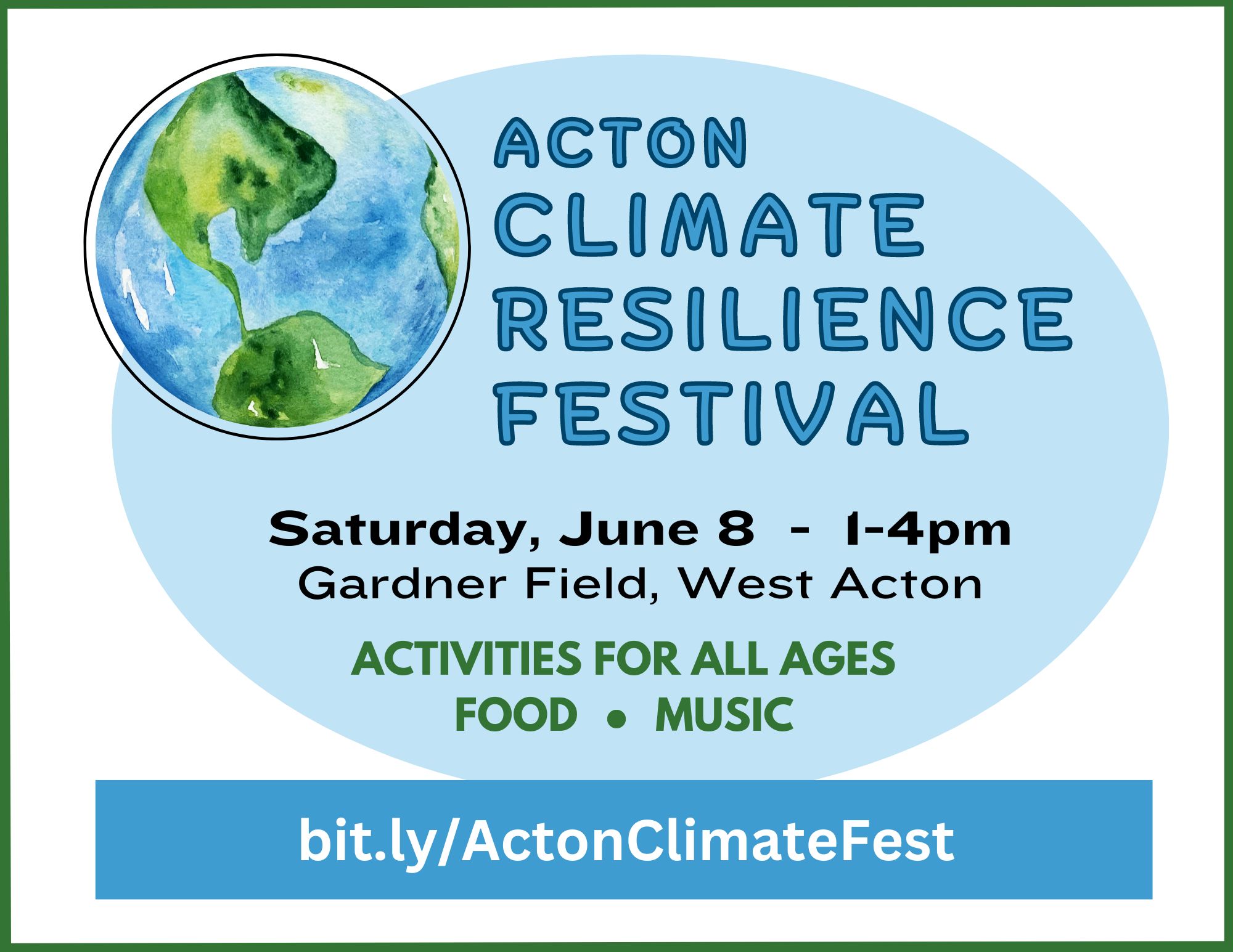 The Acton Climate Resilience Festival 2024 grows out of two efforts, one local and one statewide. The Acton Sustainability Office, in collaboration with key community groups, had hoped to bring residents together this year to share a multitude of resources about how to address the climate emergency. Residents may be aware of outreach efforts through the Acton Climate Coalition member groups, such as Green Acton, Mothers Out Front, and Elder Climate Action, as well as Energize Acton (an education effort jointly sponsored by the Town and the Climate Coalition).