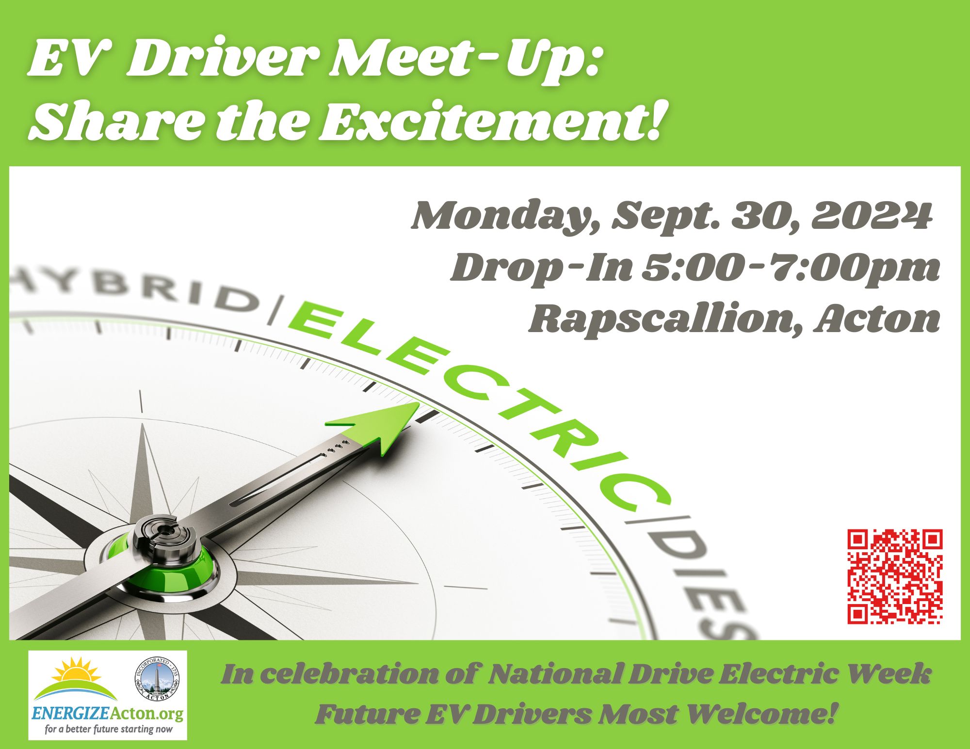 The Energize Acton experience with the EV "Petting Zoo" sessions has taught us that EV drivers love to talk about their vehicles! Thank goodness for that! Plus, EV drivers love to hear about other models and to learn about EV advances. This meet-up is a chance for us to share food and talk about our experiences, with our vehicles on hand. And perhaps even share ideas about how to better promote EVs.