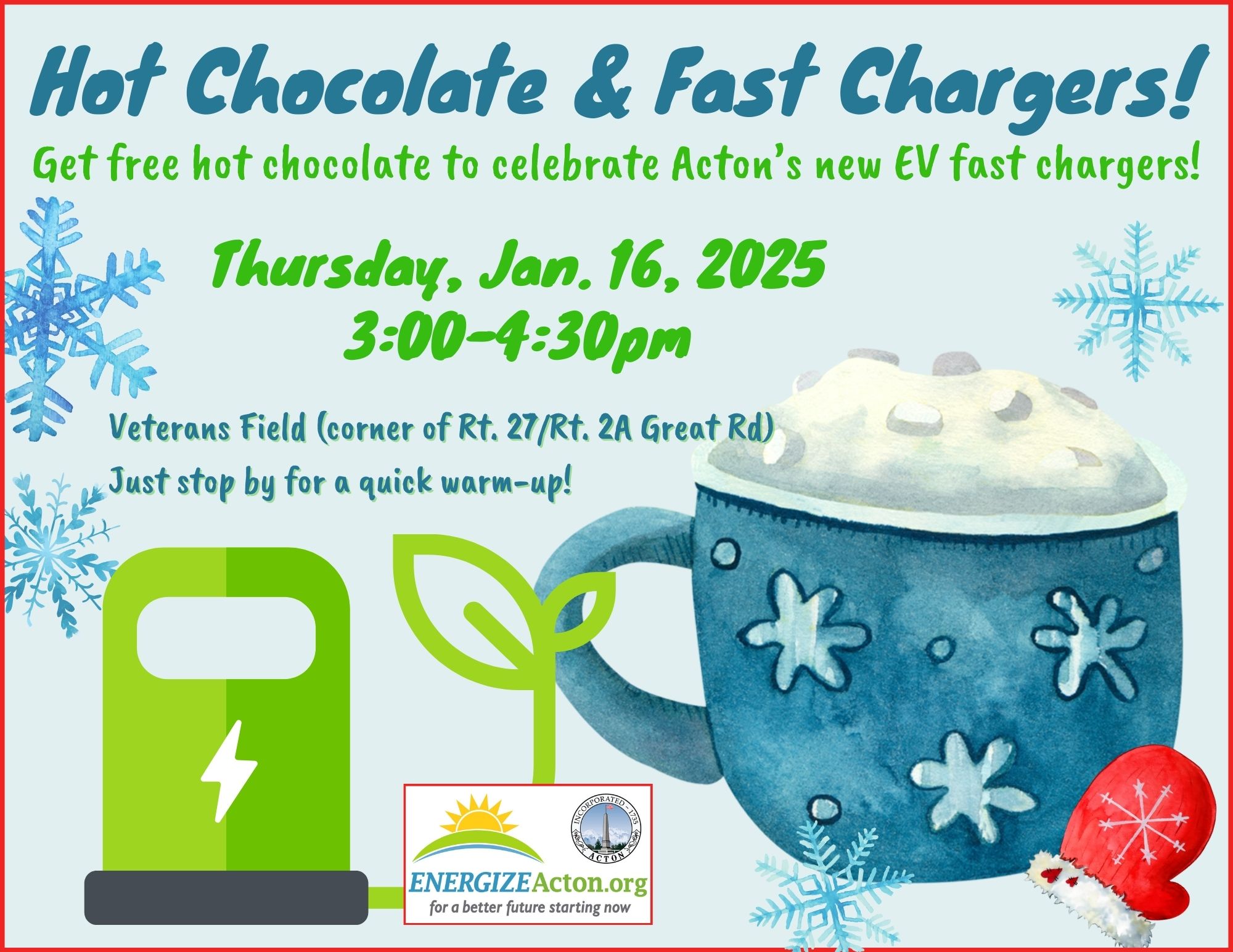 Stop by for free hot chocolate/coffee/tea and a snack at the location of the new EV fast chargers, the corner of Rt. 27 & the Great Road/Rt. 2A (kitty-corner from CVS and Kitchen Outfitters).