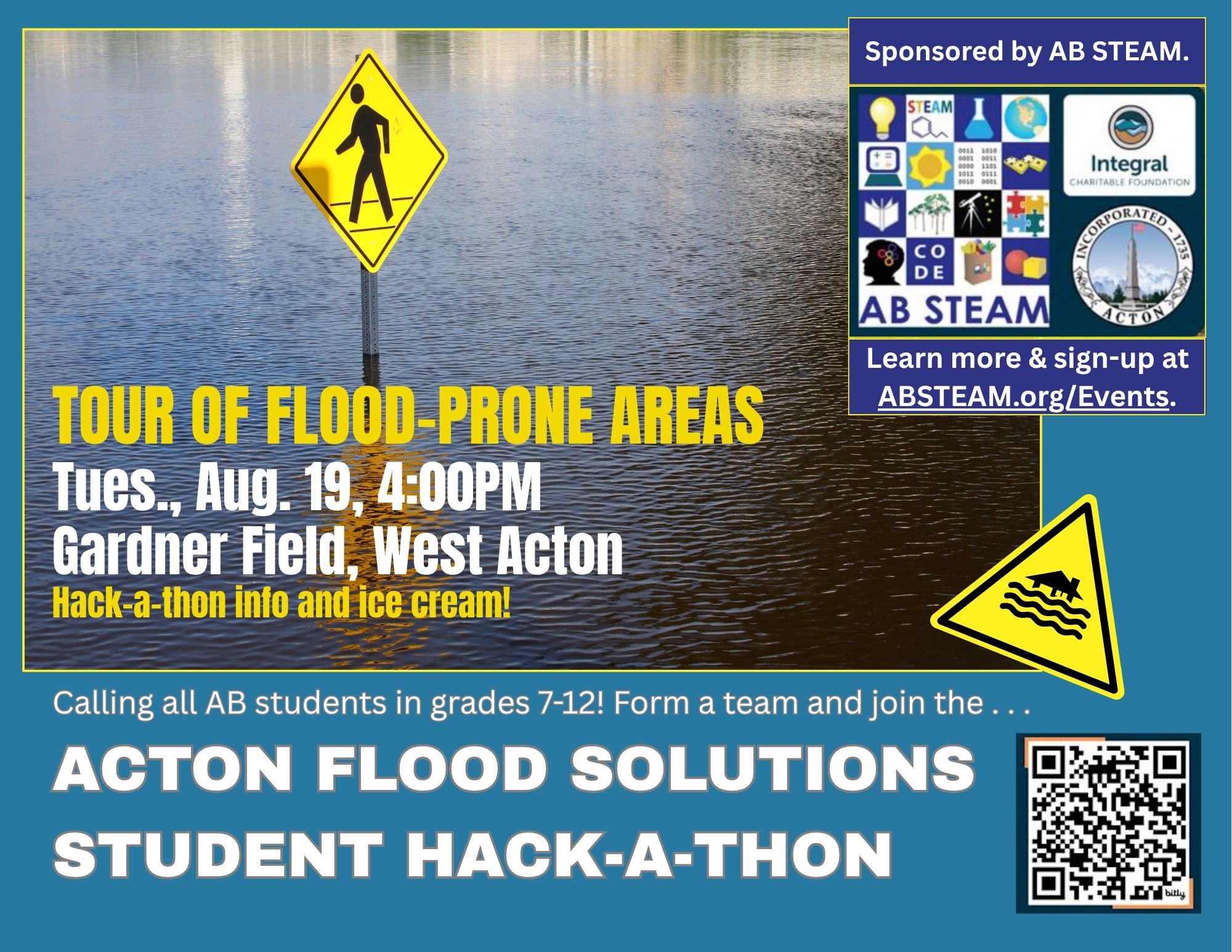 Are you a problem solver? Interested in environmental science and sustainability? This informational walk marks the first stage in the Acton Flood Solutions Student Hack-a-thon, sponsored by AB STEAM with support from the Acton Sustainability Office, the Acton Conservation Dept. and the Integral Charitable Foundation. Join us as we ask a particular question: How can we reduce flooding and the impacts of flooding in Acton in a way that is economical, sustainable, and socially and environmentally friendly?