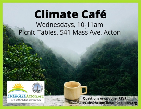 Occasionally, there may be an invited quest to start us off, but mostly the sessions will be Acton residents sharing with each other. For now, the Café will be happen weekly on Wednesday mornings at 10:00am, but we hope to expand to later times which might include a brew! For more information or to register, contact ClimateCafe@ActonClimateCoalition.org. Or just drop by the Village Works picnic tables in West Acton (541 Massachusetts Ave), just down from the Acton Coffee House.